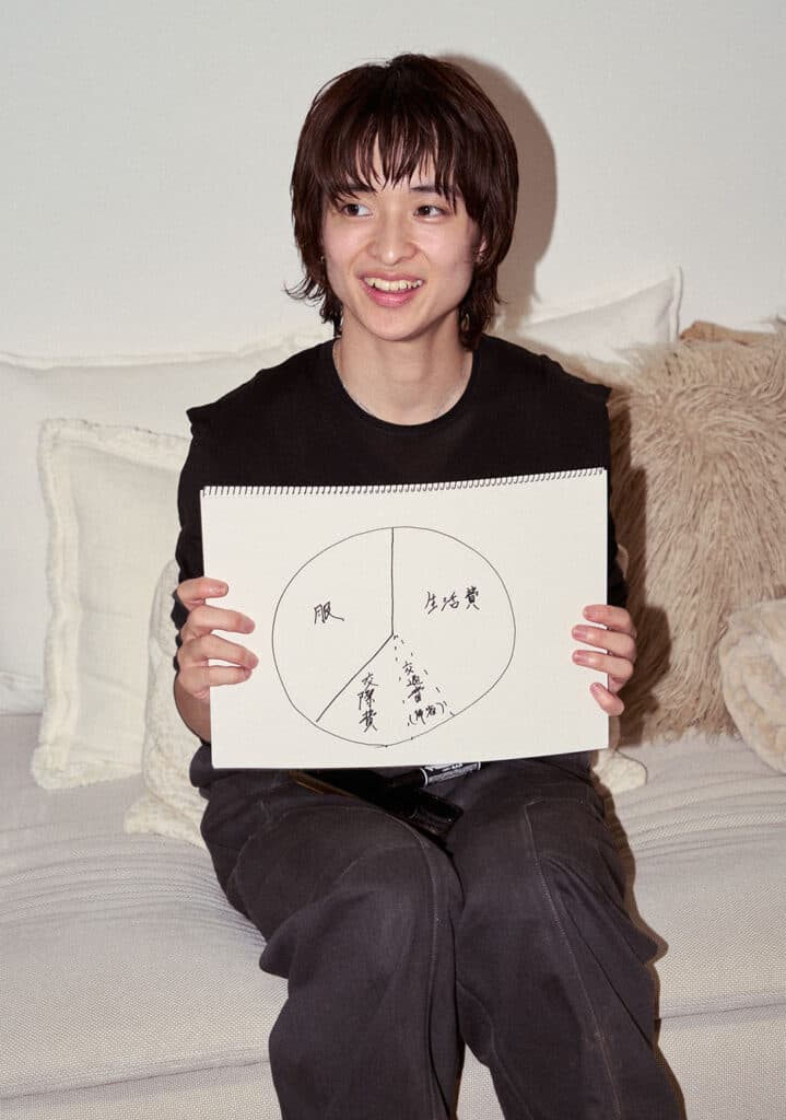 ──僕は生活費が全体の6割ぐらいを占めてます。先月は帰省するタイミングがあったので、交通費が大きかったかも。生活費のなかに交際費も入れてるんですけど、それと同じぐらい服も買ってます。試着すると欲しくなっちゃって、気づいたら家に持ち帰ってます(笑)。お金は“あると使っちゃうタイプ”です。