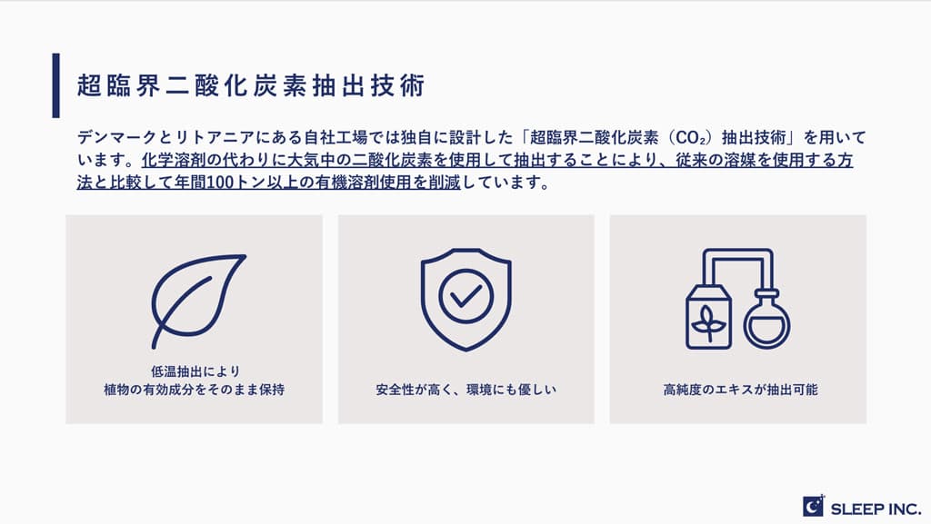 「Sleep Inc.」は、100%自然由来の成分で作られたハーブティンクチャーだ。ホップ、バレリアンルート、ジンジャー、ターメリック、レモンバーム、クローブ、セージなど、厳選された天然ハーブを独自の超臨界CO₂抽出方法で調合している。