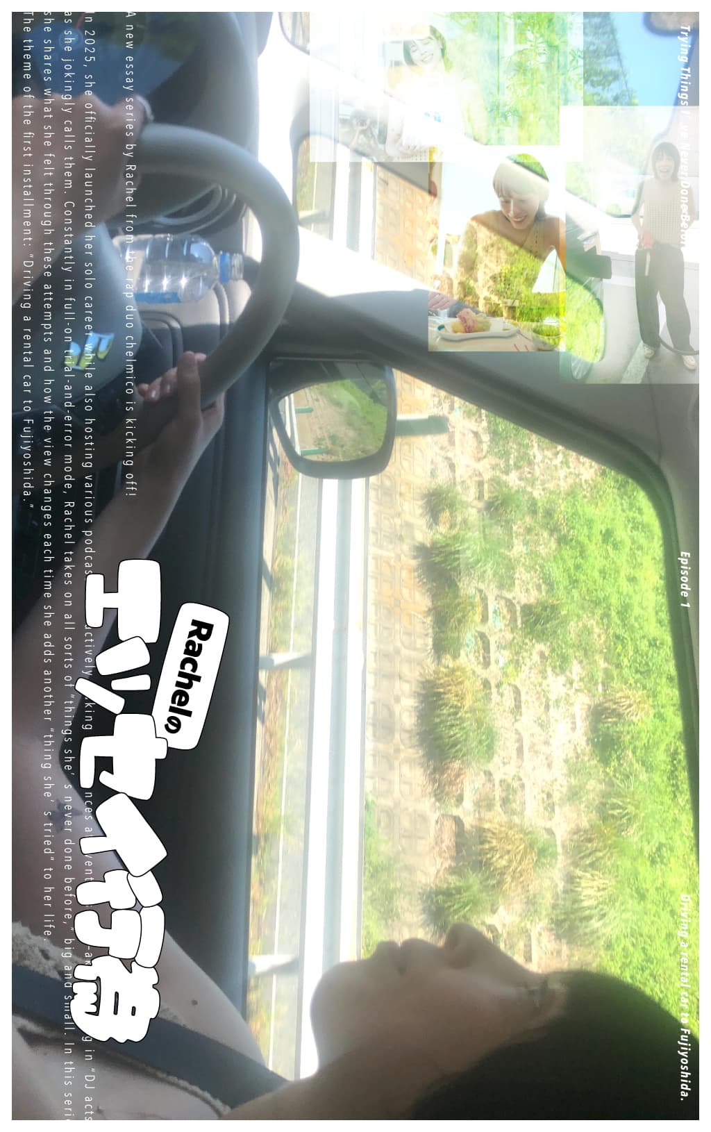 2025年にソロ活動を本格始動したほか、さまざまなポッドキャストのパーソナリティを務め、DJとしてのイベント出演(通称・DJ行為)にも積極的。日々、全力で試行錯誤しているRachelさんが、大小さまざまな“やったことないこと”に挑戦。その中で感じたことや、“やったこと”が1つ増えた景色について綴ってもらいます。初回のテーマは、「レンタカーで富士吉田まで行く」。