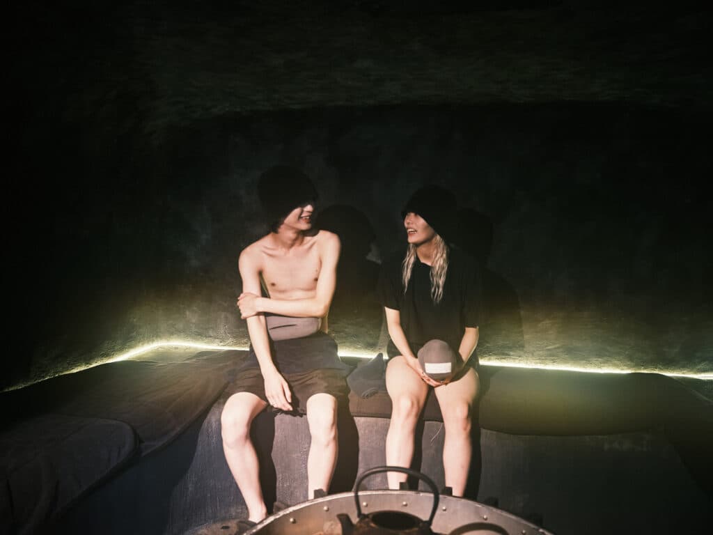 早速入ってみると、中はまるで洞窟のよう。木のサウナとの大きな違いは、その「過ごしやすさ」。土に蓄熱された熱を浴びるため、「熱っ!」という痛々しさがなく呼吸がしやすいのもポイントです。からだにやさしい温まり方で、わいわい会話を楽しみながら過ごすことができます。