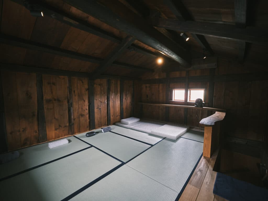 部屋に入ると、気持ちのいい畳が広がります。築150年の古民家にあった柱や畳を最大限生かした、どこか懐かしい雰囲気に心がほっと落ち着く空間。