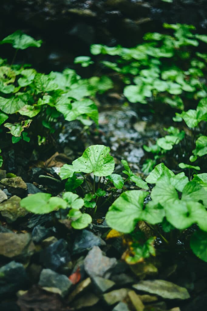 「Satologue」の庭は、かつて里の養魚場として使われていた場所。ここにはシェフ自らがオクラやトマト、ナスなど、さまざまな無農薬野菜を育てる自家農園と、さまざまな植物や生物に出合えるビオトープ、きれいな水が必要とされるわさび田があります。