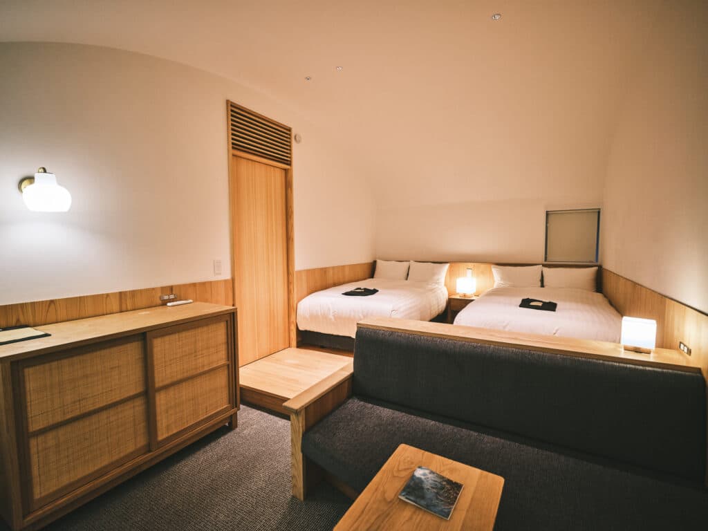 15時になったら早速チェックイン。客室の天井はアーチ状にカーブし、まるで繭に包み込まれるような安心感。ベッドもソファも、ベランダの椅子も外が見えるように設置されていて、室内でもいつでも自然を感じられます。