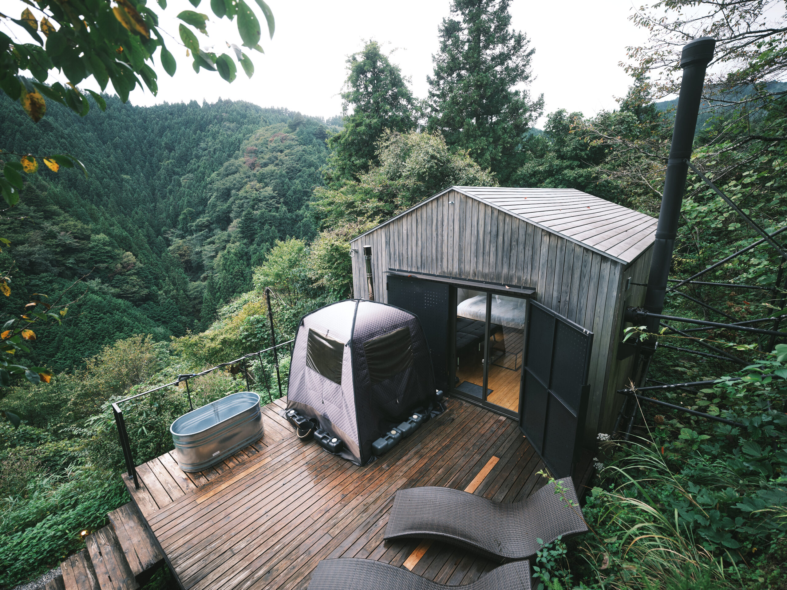 客室の外には、テントサウナと水風呂、露天薪風呂まである豪華ぶり。「できるだけ自然に近いもので」というこだわりから、サウナもお風呂も薪で温め、水は湧水を使用しています。