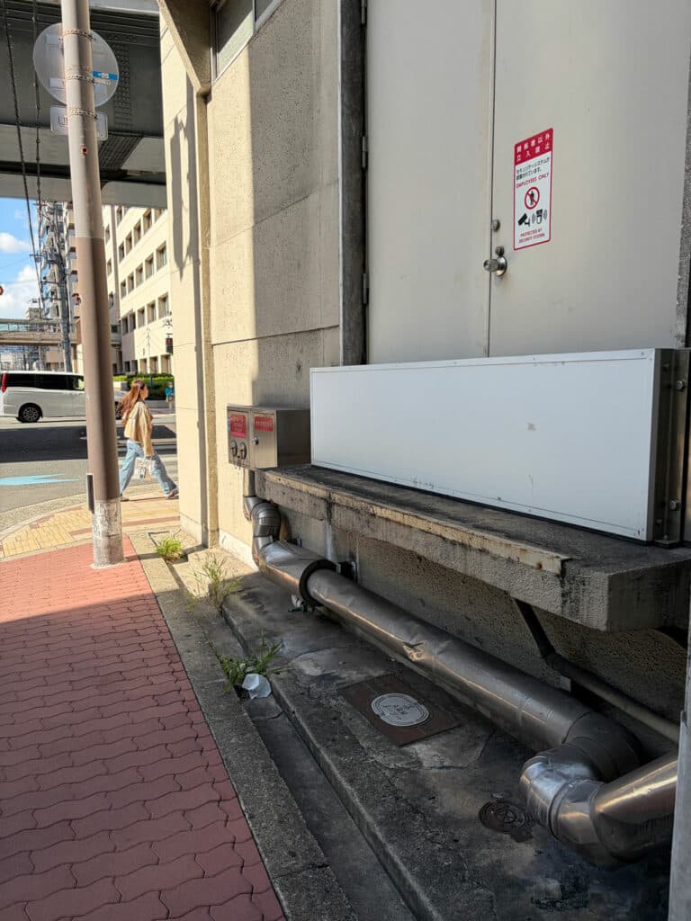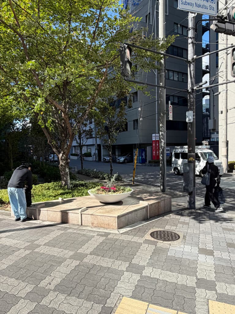 Osaka Metroの中津駅から地上へ。近くにある大通り沿いの駐輪場を歩くと、早速スポット発見。写真のフェンス沿いにあるコンクリート製の縁石です。
