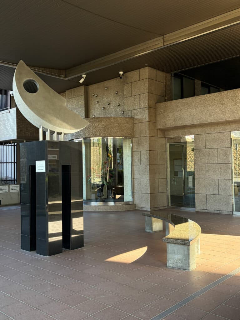 再び大通り沿いに出ると、マンション下に岡本太郎を意識していそうなオブジェ。すぐ側に完璧な大理石カーブ。直線ではなく曲がった形というのがかなりいい。スケーターにとって大理石の素材は大好物。しかしカーブ先にガラスがあったりと、リスキーなポイントも多め。形だけでいえば最高なスポットとして覚えておきます。