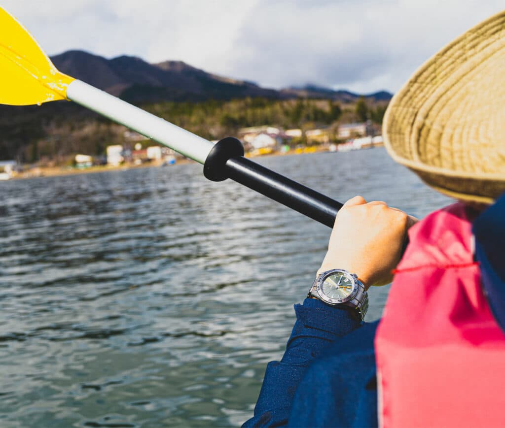 20気圧防水という高い機能性を備えており、水のアクティビティにも安心して身に着けていられる。カヤック遊びにも付き合わせたところ、キラキラと光る水面のようにインデックスやエッジの効いた針が輝く。差し色となっているカーキの補色であるオレンジのGMT針が、自然に溶け込むバランスの良さを感じさせる。
