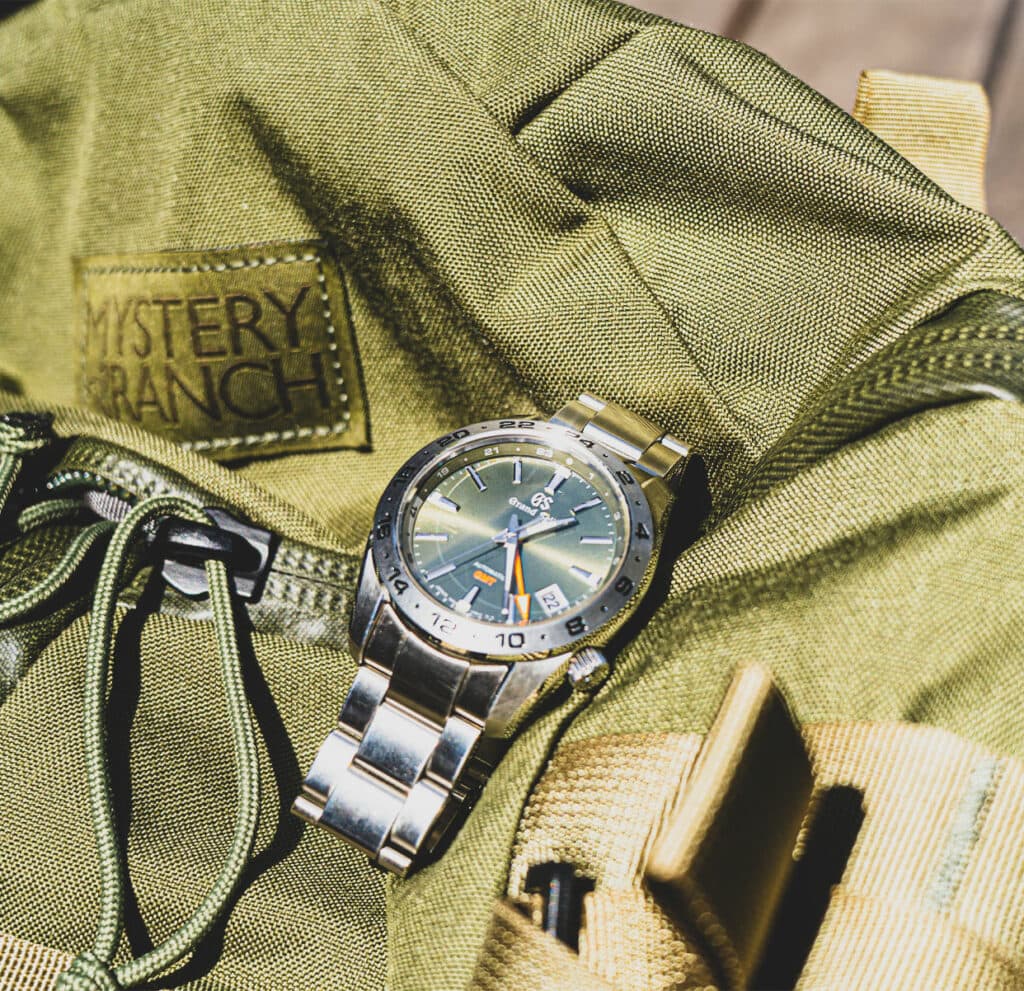 日本が海外に誇るグランドセイコーは、部品のひとつひとつまで自社で製造し、職人による組み立てにこだわった高級時計ブランド。美しいカーキのダイヤルに惹かれて購入した「SBGM247」は、コンパクトサイズのメカニカルGMTウオッチだ。40,5mmという実用性に優れたサイズ感は腕に収まりがよく、スポーツウオッチなのに高級感ある針やインデックスはグランドセイコーらしく、光を集め美しく輝く。