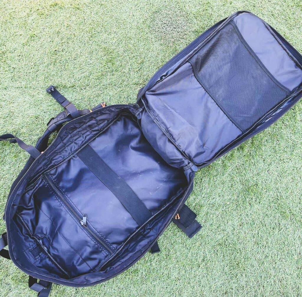 テントと寝袋はサイドにくくりつけているし、ポーチやエコバッグも外側にあるけど、それでもコレだけのアイテムを一気に運べるなら十分でしょう。酒瓶の2本も足して、ノートPCとiPad、大型のモバイルバッテリーを入れてのワーケーションにも対応できますから。