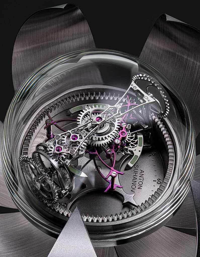 この「ロータス」は、造形美だけでなくメカニズムも驚異的だ。動力ゼンマイなどは、丸いベース部分に収められており、その天面が24時間で一周することで時刻表示となる。そしてスッと伸びた蓮の花が心臓部となっており、花の内側にあるガラスドームの中には3D回転する「トリプル・アクシス・トゥールビヨン」が収められ、正確に回転して時を刻む。
