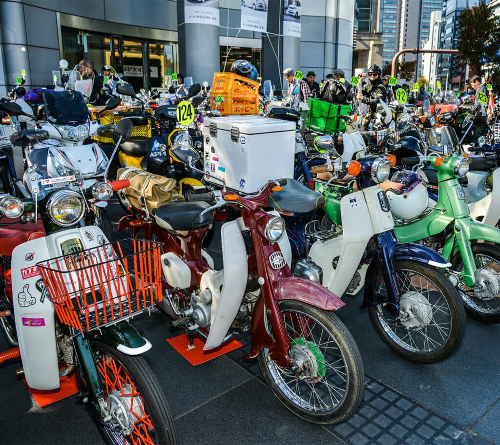 構造がシンプルでカスタムしやすい点もスーパーカブ人気の理由のひとつ。国内外のメーカーから様々なカスタムパーツが発売されており、自分のライフスタイルに合った1台を作りあげることができる。写真は毎年開催されている「カフェカブミーティング in 青山」の様子(2020年はコロナの影響でオンライン開催)。
