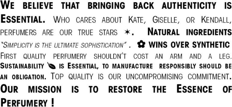 本質を取り戻すというミッションの元、Essential Parfums は「Haute perfumery, sustainable and affordable」(質、サステナブル、手頃な価格)を目指しています。