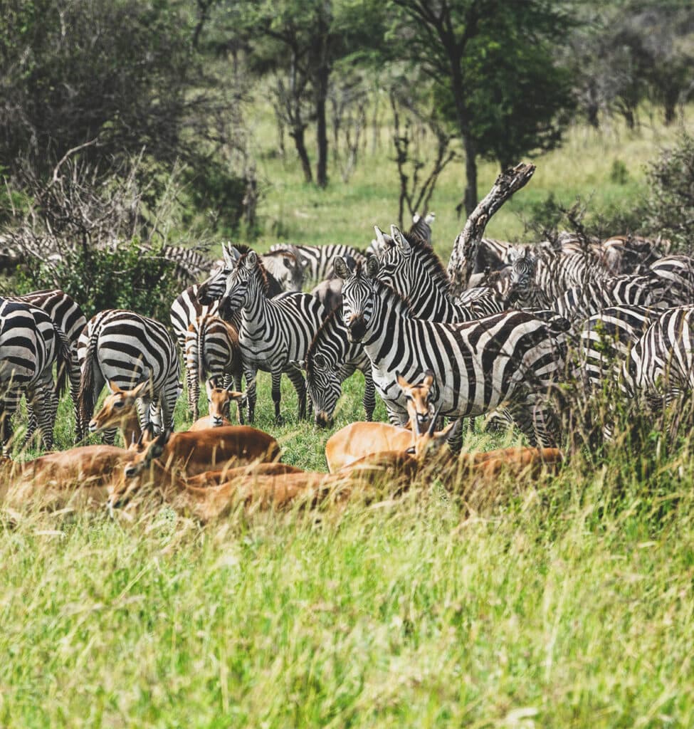 ある夕刻、車を停めて、草食動物の群れを観察していた。シマウマ、インパラなどが30頭ほどいたと思う。種を超えて動物が一緒に過ごす光景は、なんとも平和だった。