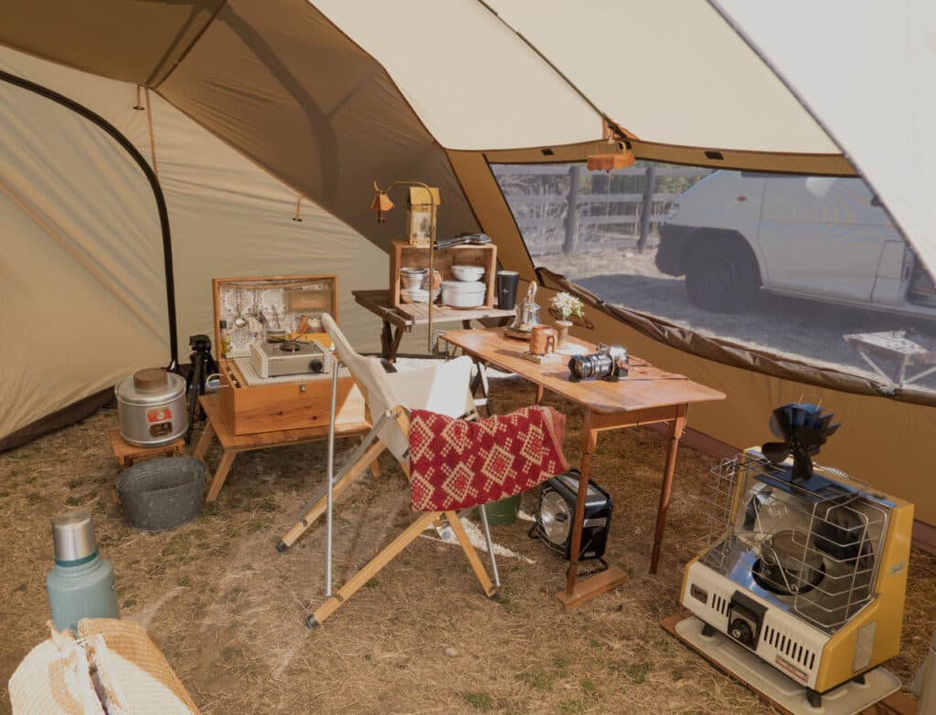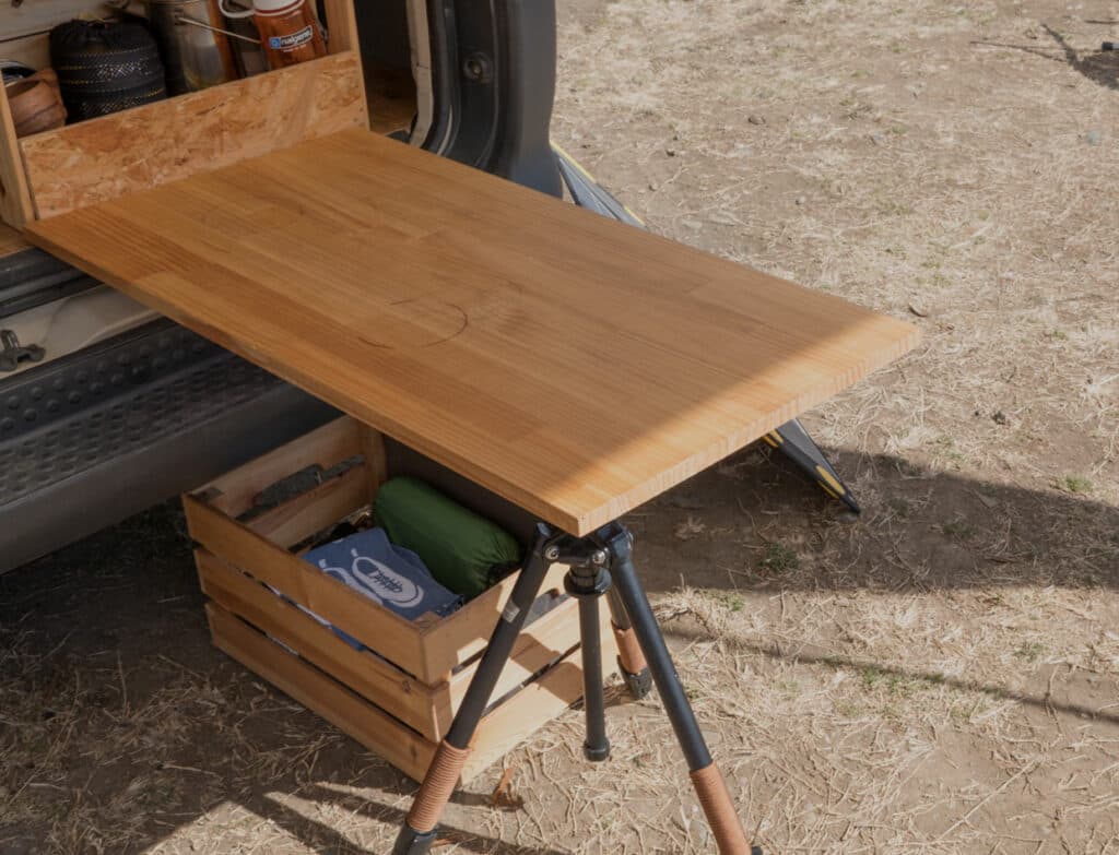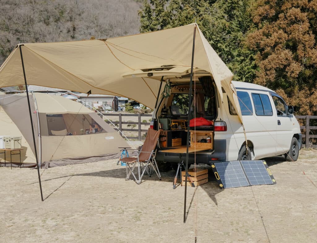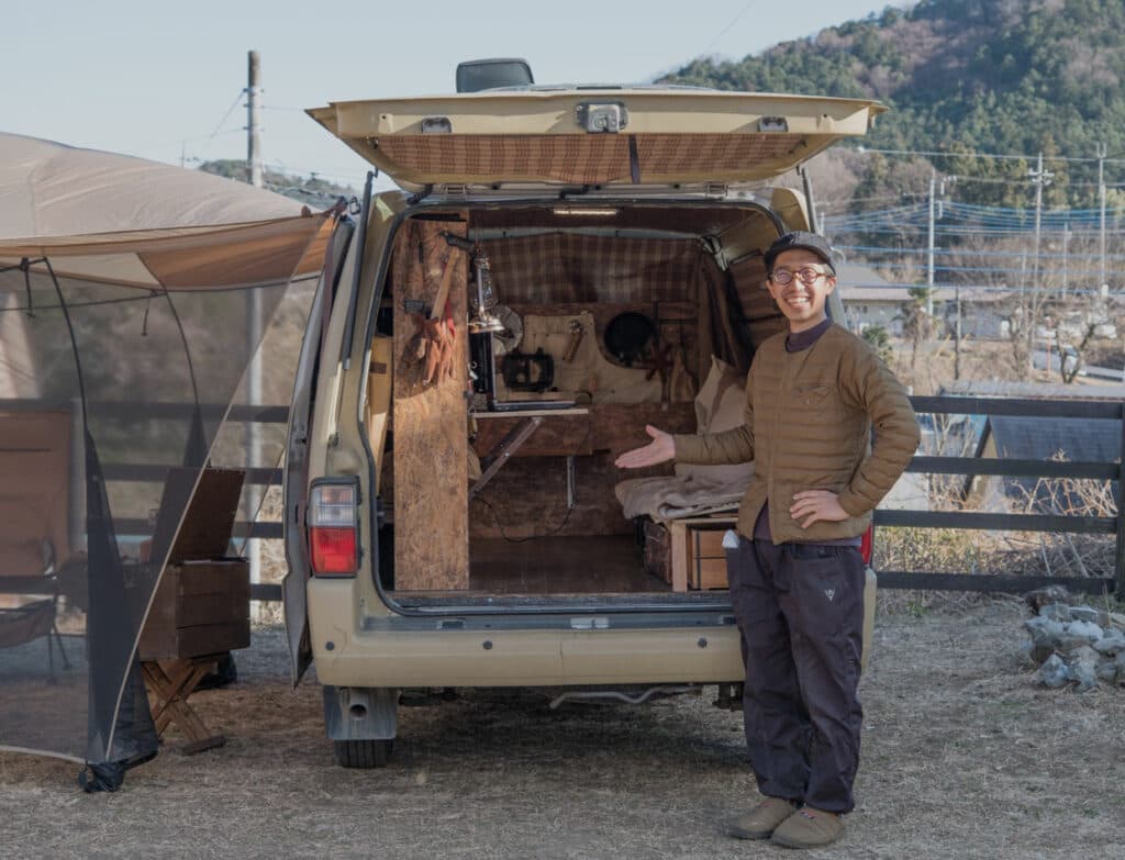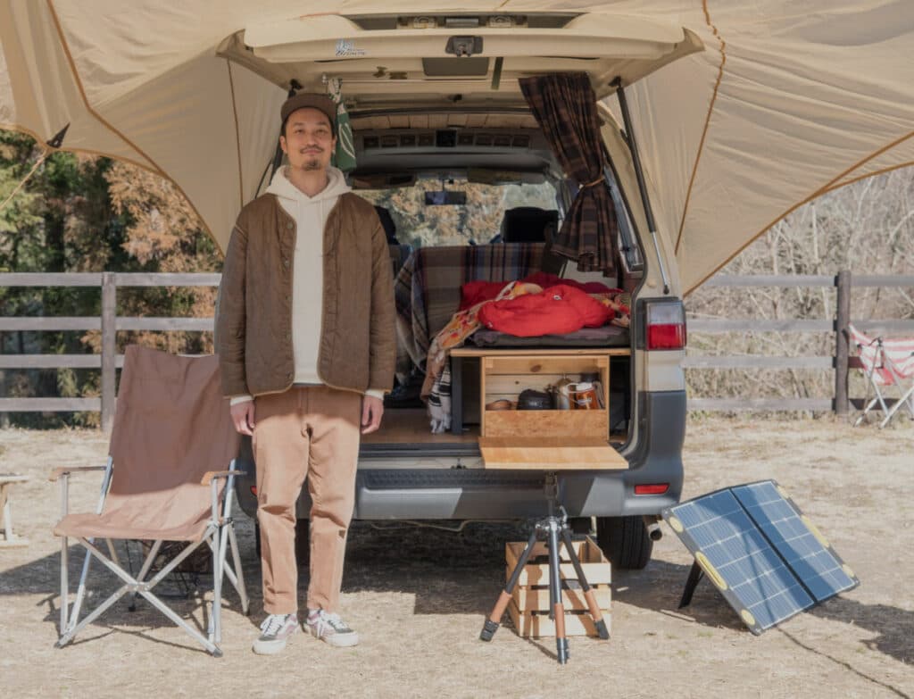 「コロナ禍の緊急事態宣言でキャンプ場が閉鎖されたことがあったじゃないですか。だったらどこでも手軽にキャンプできる車を自分で作ればいいのではと思ったんです。SNSで海外のバンライファを参考にしつつ、愛用しているキャンプギアの雰囲気にマッチするよう作りあげました」
