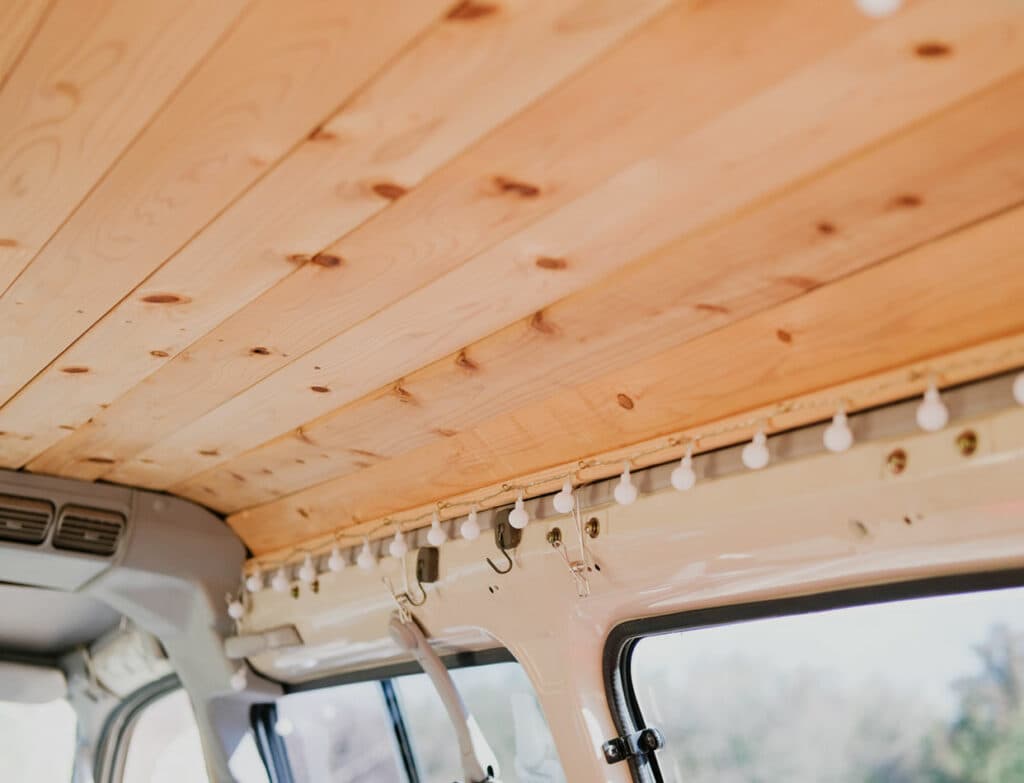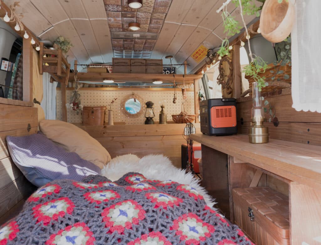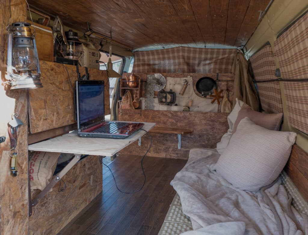 バンライフカーのインテリアは天井や壁を板張りにするなど、ウッディな雰囲気で仕立てられる。木材は入手しやすく、加工しやすいというのがもともとの理由だが、結果的に市販キャンピングカーとの差異が際立つポイントとなっている。
