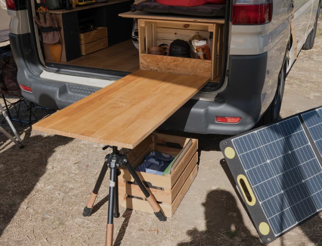イベントの主催者である逸見真央さんは30万円で購入したマツダ「ボンゴバン」をDIYでバンライフカーに。ホームセンターで簡単に入手できるOSB合板を使って理想の車中泊空間に仕上げている。キッチン用品などを収納する棚は扉を開けることでテーブルにもなる優れもの。一般的なキャンピングカーのように車内だけで過ごすのではなく、キャンプと車中泊の折衷スタイルだ。