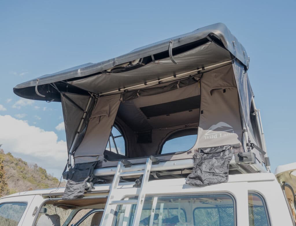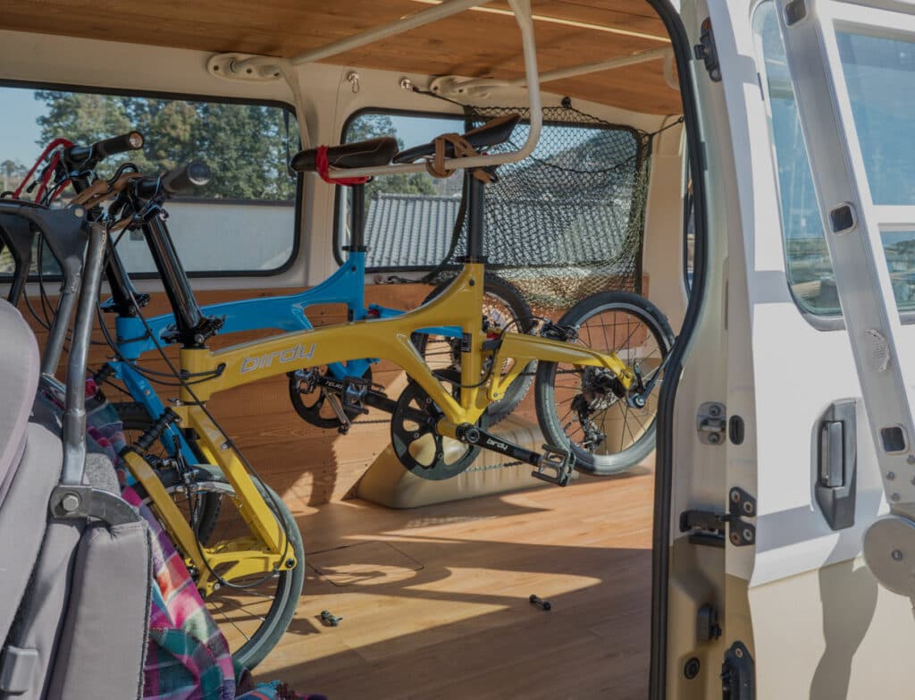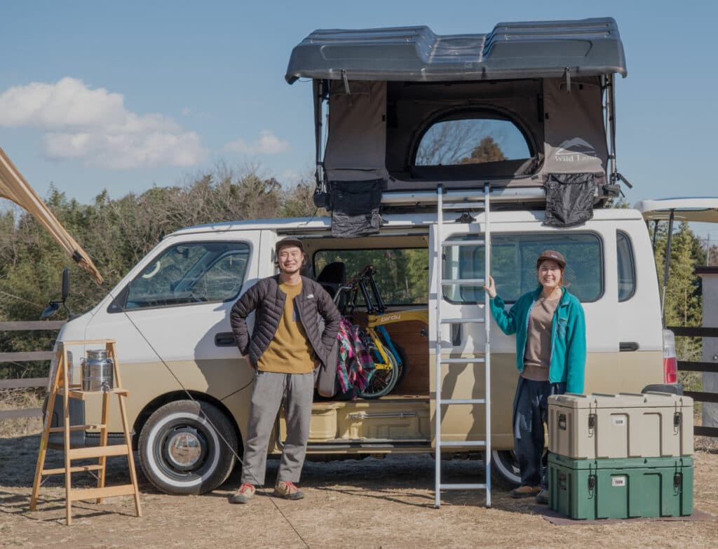 イベントの会場となった「NONIWA」の代表、青木夫妻は日産「キャラバン」のインテリアを板張りにして、ルーフトップテントを装着。サイクリングと車中泊が両方楽しめる仕様となっている。制作は外装の塗装も含め、キャンパーカスタムを専門に行う「CielBleu.」に依頼したという。
