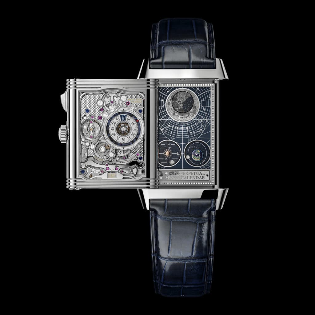 実はレベルソは時計本体と台座に分かれていて、台座の上に取り付けた時計がパタンパタンとひっくり返る仕組みだ。台座は台座でしかないのだが、ここにジャガー・ルクルトは目を付けた。まずは2006年、台座の表面に機構を組み込んだ3面ウォッチ「レベルソ・グランド・コンプリカシオン・トリプティック」を発表する。そしてその進化版となるのが、2021年に登場した4面ウォッチ「レベルソ・ハイブリス・メカニカ・キャリバー185」だ。