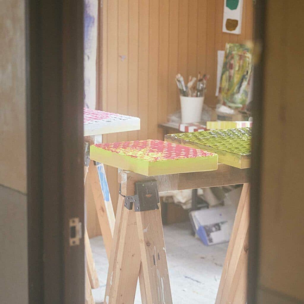 絵具が重なりあう「outline」シリーズは、サイズを測りマスキングして規則正しく描くチェック柄と、ダイナミックに配置された色面が印象的。「パズルのようにしっくりくるかたちが絶対にあって、配置は一発描きなことが多い」という松岡さん。作品が放つ独特な魅力、その理由とは。