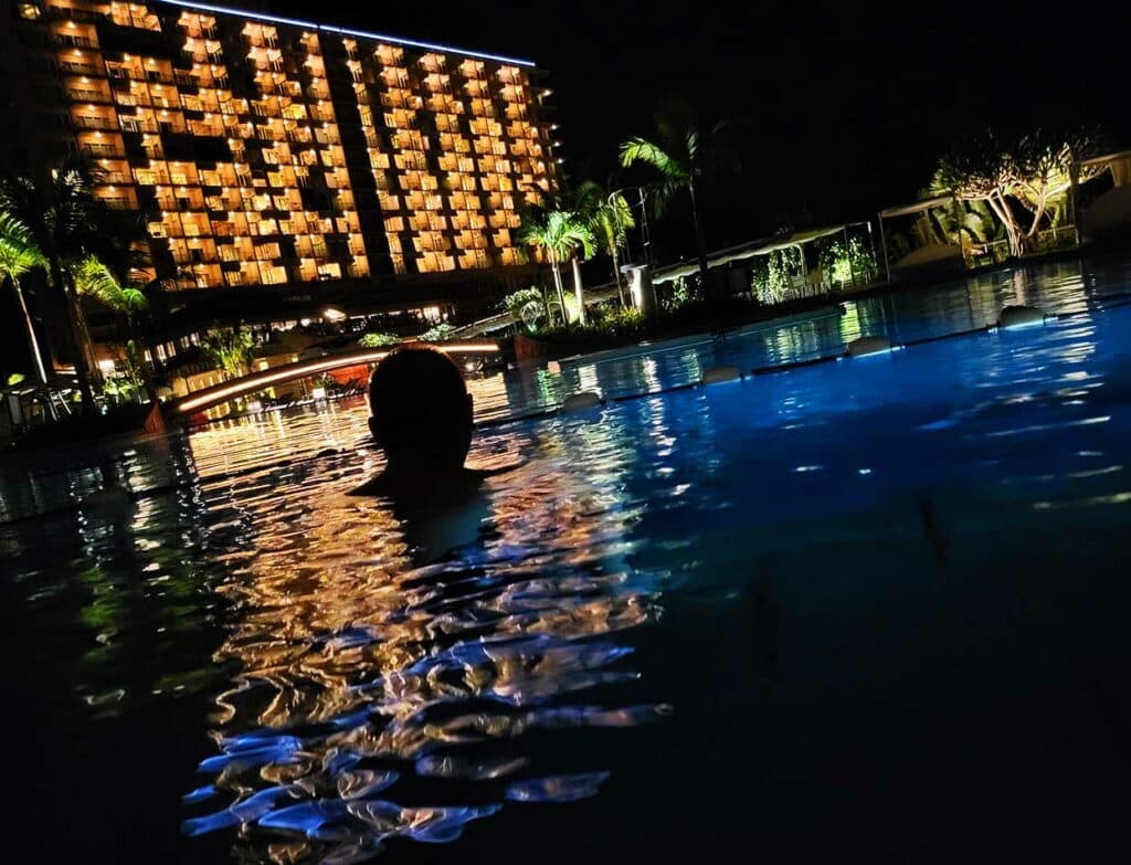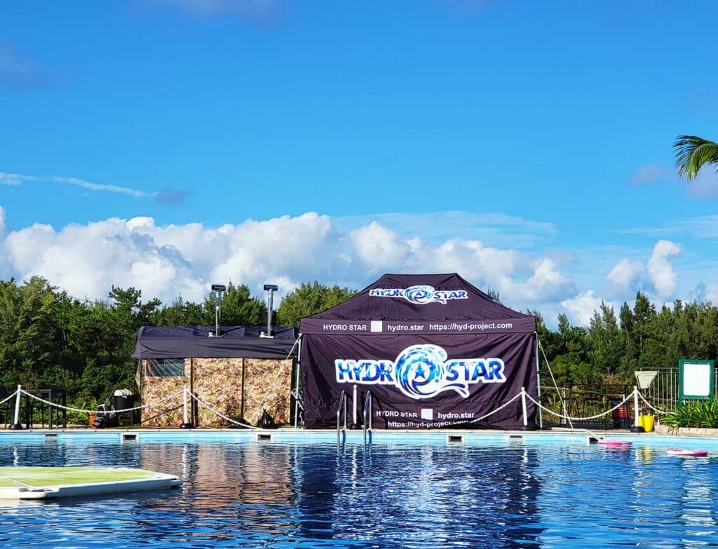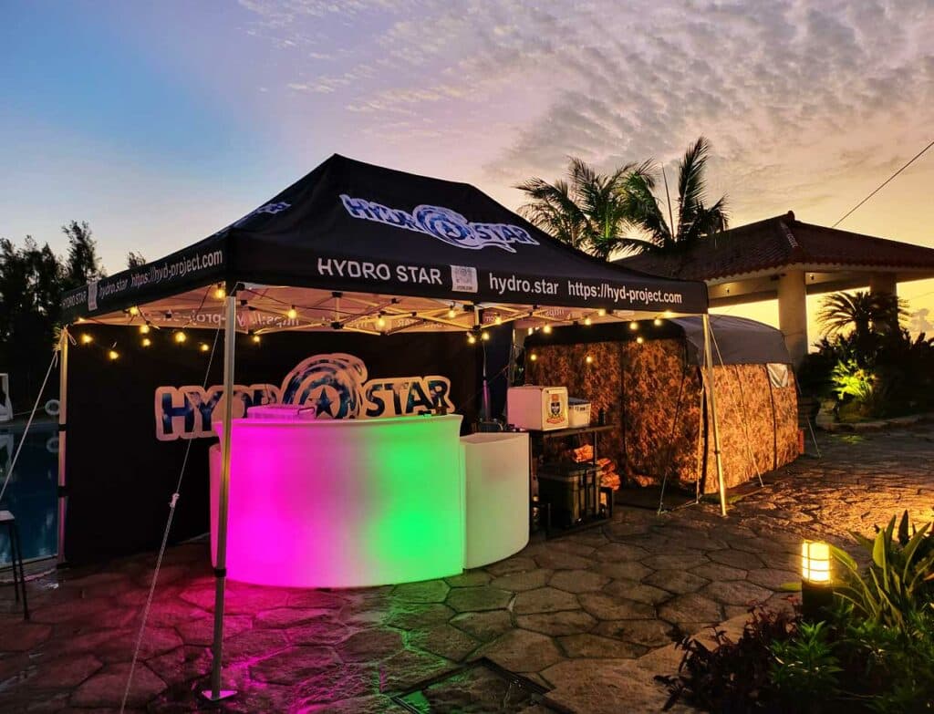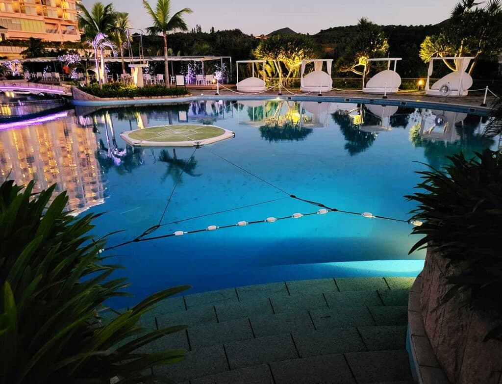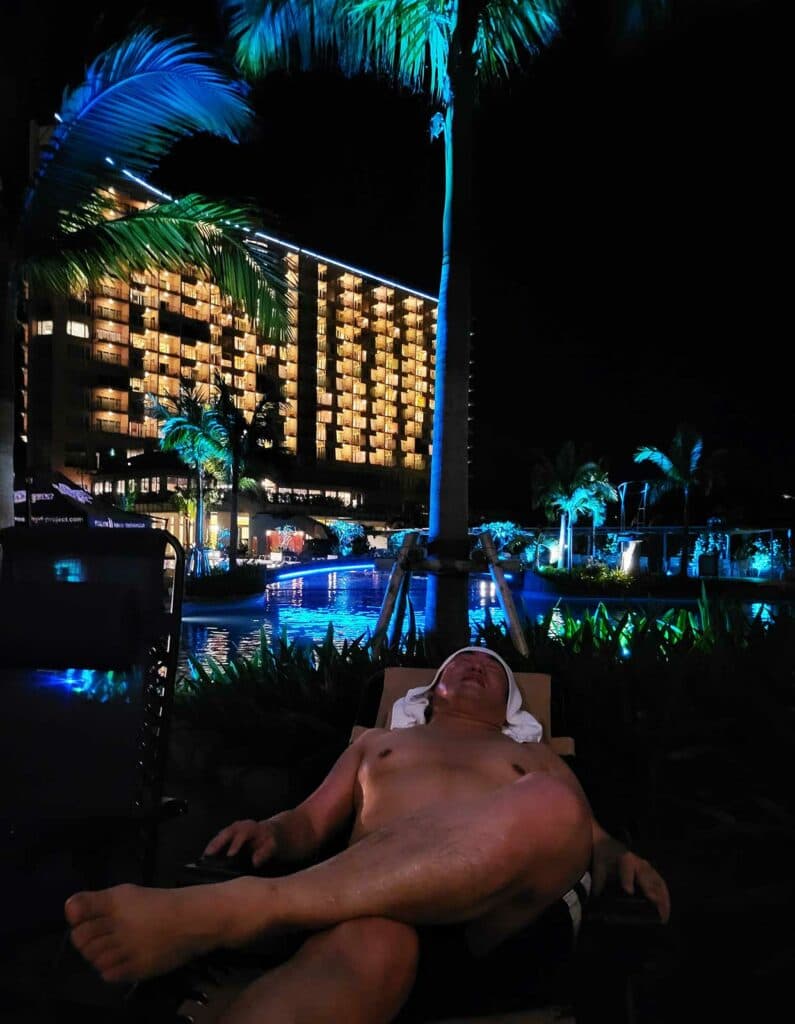 夕暮れのガーデンプールサイド。ナイトプールが始まろうとしているキラキラした空間に水着で降り立つ。目の前にはテントサウナ。正直、この時点ではちょっと後悔していた。さっさと名護の街中のローカルな居酒屋「蓬莱」へ行けばよかった、と。レンタル用のハンドタオルとペットボトルの水をスタッフに渡される。サウナの説明をひとしきり受けたら、あとは自分のタイミングで入るだけだ。