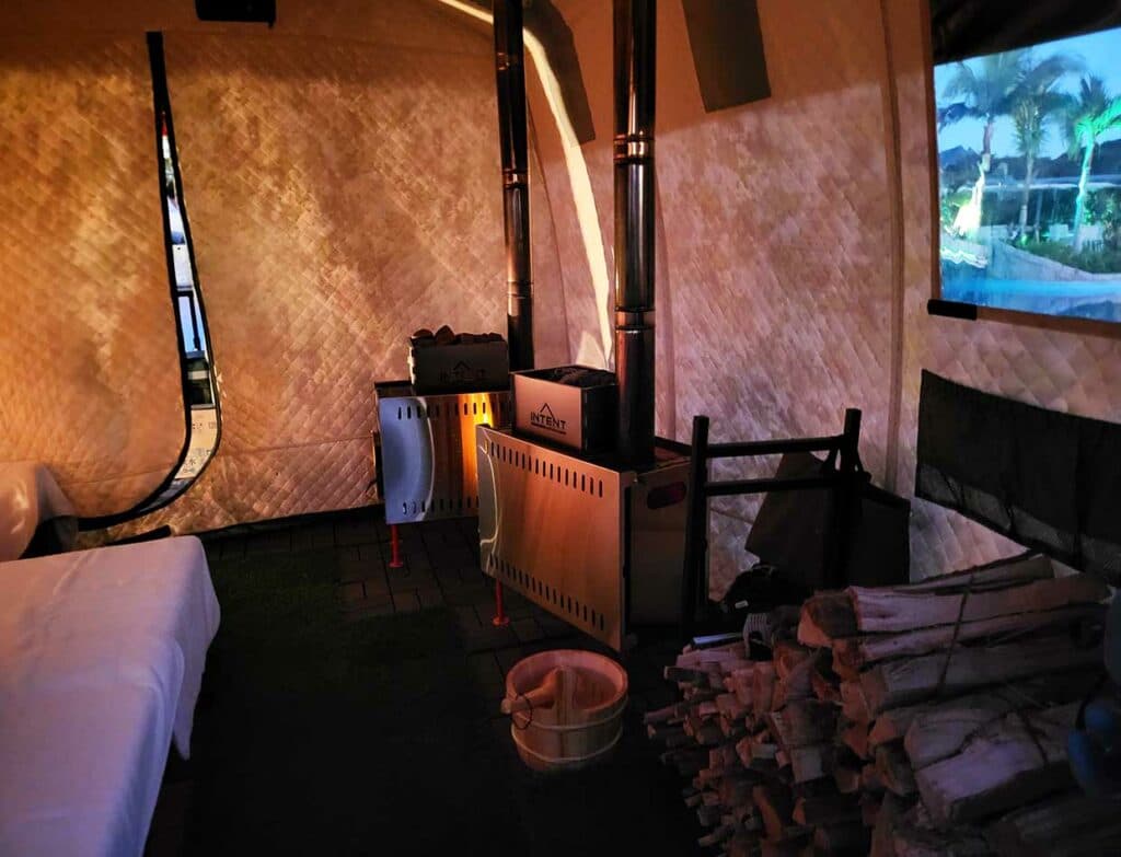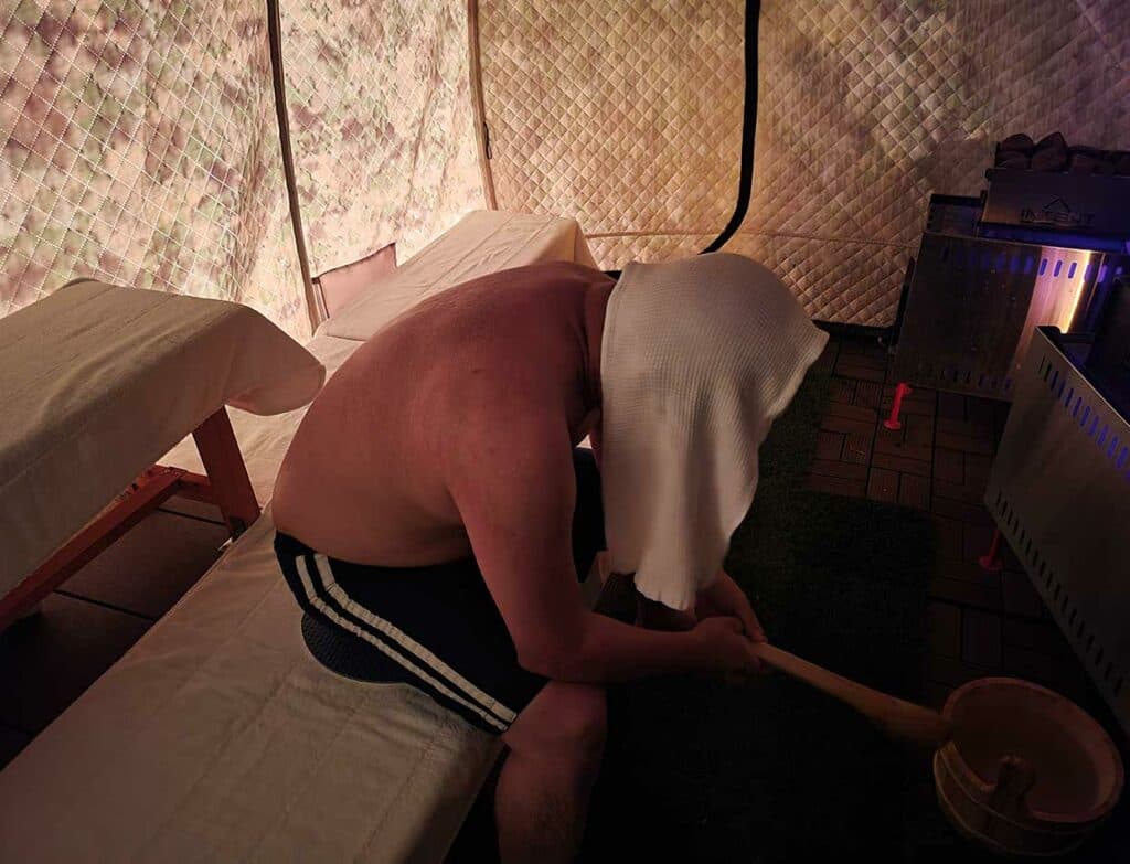 テント内にはストーブが2台設置され、スチーム用の水が桶になみなみと貯められていた。サウナ内の温度は90度弱。いきなりの熱さに気落ちしながらも、ベンチに座ってとりあえず目を瞑ってみる。息を吸うだけで鼻が熱い。とはいえ、今回は大勢の人と共有する空間ではなく偶然貸し切り状態、サウナ内は完全プライベート空間。サウナが苦手な自分でも、人目などを気にすることなく自由に過ごせるのが唯一の救いだった。