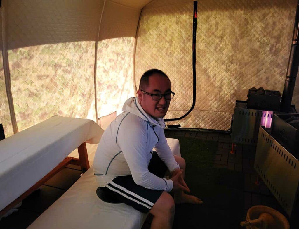 最初は撮影のために裸体は晒したくない! とラッシュガードを着ていたが、もうそれどころではない。熱いし、プライベート空間だし、そもそも一人だし、一番快適な姿で過ごしていたら、10分を過ぎた頃だろうか? 熱さにも慣れてきて、だんだんと心地良くなってきた。耐えに耐え抜いて、とりあえず15分ほど汗を掻き、テント外へと出る。