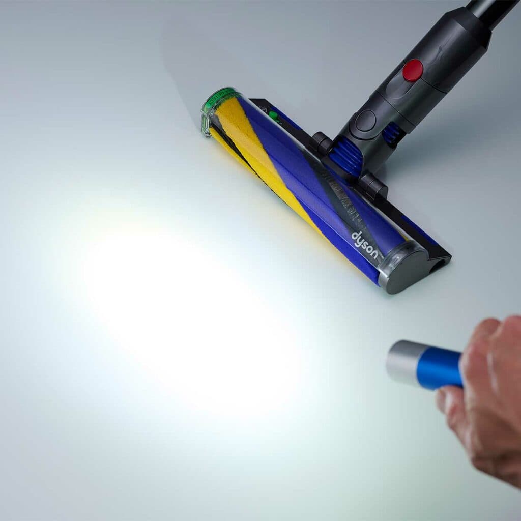 壁に沿って掃除をするときも、レーザーの光がホコリや細かい粒子がたまりやすい壁の直角部分をしっかり照らすことができます。もちろん、ヘッドがどんな動き方をしても、安定した光で照らせるような工夫もされています。